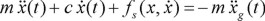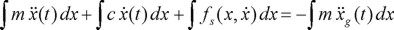 donde m representa la masa del sistema, c es el coeficiente de amortiguamiento viscoso del sistema, fs(x, ẋ) es la fuerza restitutiva, ẍg es la aceleración del terreno, y x es el desplazamiento relativo del sistema con respecto al del terreno; el punto sobre la literal indica derivada con respecto al tiempo. En el caso de un sistema elástico lineal, fs(x, ẋ) = kx, donde k es la rigidez del sistema. Integrando cada miembro de la de la ecuación 1 con respecto a x se tiene: