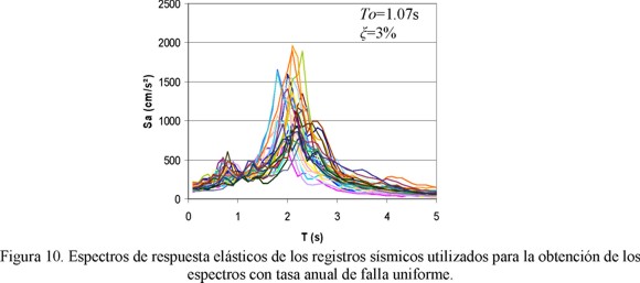 El coeficiente sísmico requerido se determina utilizando el espectro de ductilidad para νFO=0.003. Los espectros utilizados en este trabajo (tanto de ductilidad como de energía histerética asociados a una TAFU) se obtuvieron a partir de 31 acelerogramas reales registrados en la zona IIIb del valle de México. La figura 10 ilustra los espectros de respuesta elásticos para 3% de amortiguamiento de los 31 acelerogramas utilizados en este estudio. Mientras que este nivel de amortiguamiento ha sido utilizado en otros estudios para estructuras de acero (Popov et al. 1989), los registros están escalados para la pseudoaceleración en el periodo de vibración de la estructura (To=1.07s).