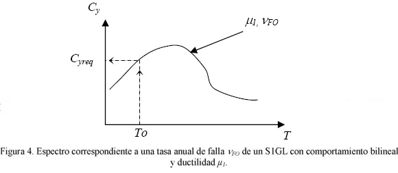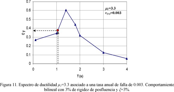 Se deben tomar en cuenta las diferencias entre la respuesta de una estructura y su S1GL equivalente, ya que dichos espectros se obtuvieron para S1GL. Esto se realiza mediante el factor de transformación de ductilidad. Utilizando el factor de transformación de ductilidad del S1GL equivalente (Bojórquez y Ruiz 2007) se obtiene μ1=3.3. Por lo tanto, considerando νFO=0.003, y una ductilidad μ1=3.3, se obtiene un Cyreq=0.375 a partir del espectro de la figura 11 para un periodo To=1.07s.