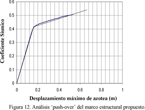 De un análisis de empuje lateral estático 'push over' (figura 12) se obtiene CyG=0.41. En la figura 12, el eje horizontal indica el desplazamiento máximo de azotea; mientras que el eje vertical representa el coeficiente sísmico, que es la relación entre el cortante basal dividido entre el peso total de la estructura. Dado que CyG ≥ Cyreq (0.41>0.375), entonces, se cumple la primera condición de diseño, y se continúa verificando la siguiente condición de aceptación.
