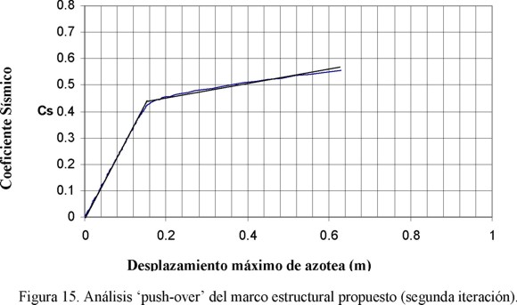 De un análisis 'push over' (figura 15) se obtiene Cyreal=0.43. Como Cyreal ≥ Cyreq (0.43>0.36), entonces se cumple la primera condición de diseño, y se continúa verificando las siguientes condiciones de aceptación.
