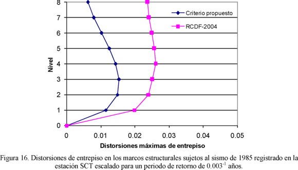 En la figura 16 se comparan las distorsiones de entrepiso. Se observan diferencias entre ambos diseños. Las distorsiones son mayores en la estructura diseñada con el RCFD 2004. Por ejemplo, la distorsión máxima de entrepiso en este marco es de alrededor de 0.026, mientras que en el marco diseñado con el procedimiento planteado es de 0.016. Esto representa una reducción del 38% en las distorsiones cuando se utiliza el criterio aquí planteado. La distorsión de entrepiso es el principal parámetro usado para diseño sísmico en la mayoría de los códigos del mundo. Se concluye que el procedimiento propuesto influye en el nivel de confiabilidad estructural a través de dar lugar a una estructura que exhibe importantes reducciones en los niveles de desplazamientos máximos de entrepiso. Note que esto se logra con un ligero incremento (del 3%) en el peso de la estructura.