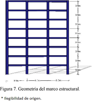 El criterio de diseño propuesto se aplica a un marco estructural de acero de ocho niveles y tres crujías que se considera ubicado en la zona IIIb del valle de México. Las características geométricas del marco se muestran en la figura 7. Es importante mencionar que se parte de un prediseño que puede ser establecido mediante un código de diseño sísmico o algún procedimiento simplificado. Se utilizaron secciones W de acero (AISC, 2003) tanto para las vigas como para las columnas. En la tabla 1 se muestran las secciones W en los diferentes niveles del marco estructural.