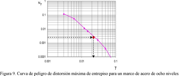 El primer paso para el diseño sísmico consiste en establecer el nivel de confiabilidad del sistema a través de la tasa anual de falla estructural, en este caso se estable una tasa anual de falla νFO=0.003 que está asociada a una capacidad de ductilidad global de la estructura μG=3. La tasa anual de falla se seleccionó con base en las curvas de peligro de demanda que presentaría un marco estructural de acero diseñado con el RCDF 2004 con características similares a la estructura que se diseñará con el método propuesto. La figura 8 ilustra la correspondiente curva de peligro de demanda para una estructura con características similares e igual número de niveles a la considerada en el ejemplo ilustrativo. Se observa que la tasa anual de falla asociada a μG=3 es igual a 0.003. Se supone que tanto la ductilidad, la distorsión máxima de entrepiso y la energía histerética normalizada estarán asociadas a un mismo nivel de tasa anual de falla. La distorsión máxima de entrepiso resulta γtol=0.023 para una νFO=0.003 de acuerdo a la curva de peligro establecida por Bojórquez et al. (2007) para la distorsión (ver figura 9). Finalmente, la energía histerética normalizada con respecto a la fuerza y resistencia de fluencia del sistema (ENG) asociada a νFO=0.003 se obtendrá más adelante (mediante un espectro de ENG con TAFU).