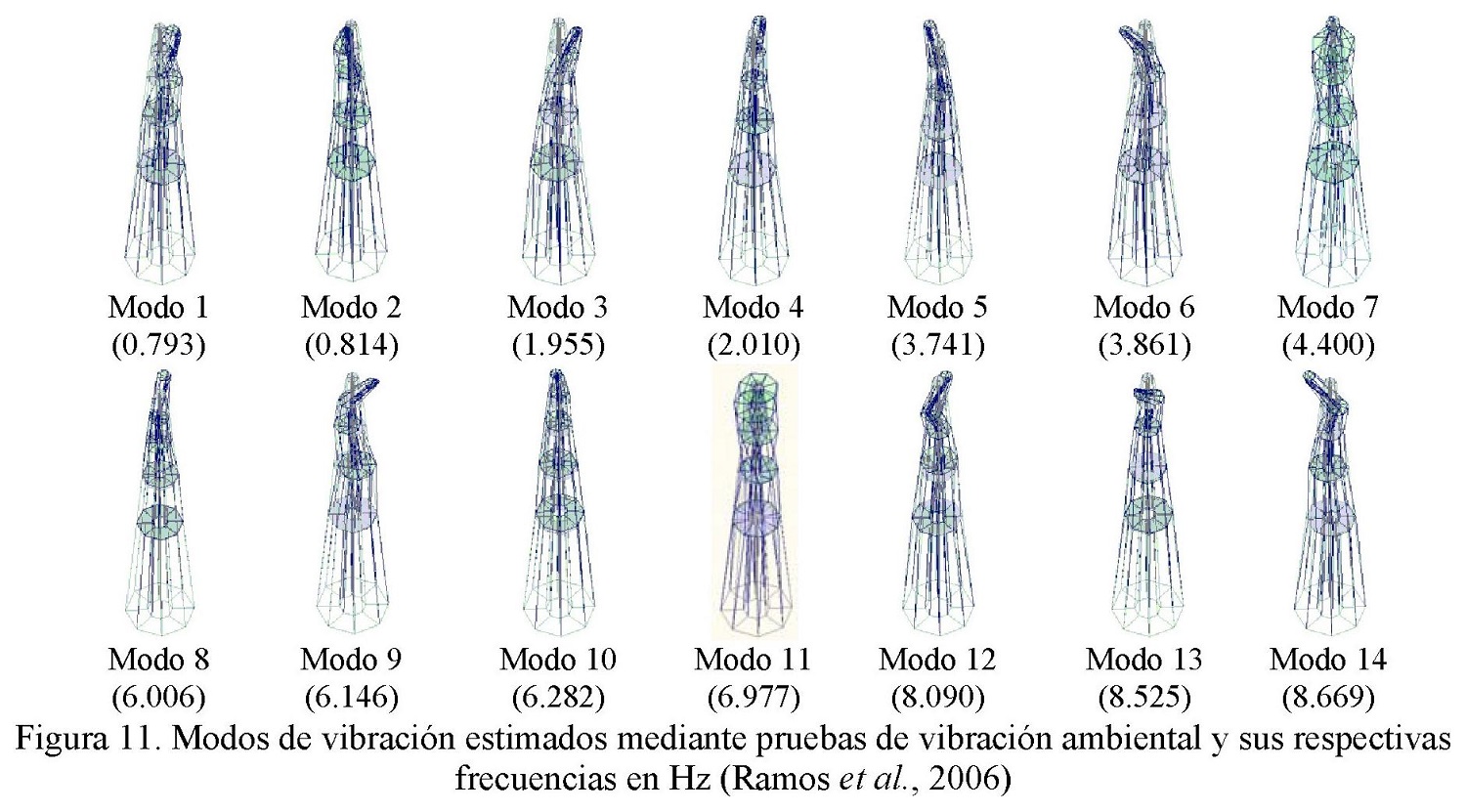 Los tres modelos se calibraron utilizando las pruebas de vibración ambiental realizadas en el minarete (Ramos et al., 2006). El objetivo de estas pruebas fue la determinación de las propiedades dinámicas de la torre (frecuencias y modos de vibrar, así como los amortiguamientos modales). Se obtuvieron 14 modos de vibrar: 10 modos de flexión, dos modos de torsión, un axial y un modo combinado (Fig. 11). Utilizando las ecuaciones 1 a 3 se obtuvieron los módulos de elasticidad de los diferentes materiales que constituyen el minarete.