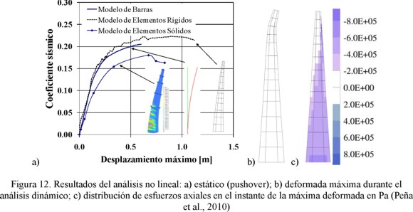 De esta manera, una vez comprobadas que las hipótesis simplificadoras de los modelos de elementos barra y rígidos eran válidas, se realizaron análisis no-lineales, tanto estáticos (pushover) como dinámicos paso a paso. Por la velocidad de cálculo, el modelo de elementos rígidos se uso para hacer análisis preliminares, con el fin de observar el comportamiento de la torre. De los análisis estáticos no lineales se observa que la base de la torre es la zona más vulnerable (Fig. 12a). Sin embargo, los análisis dinámicos no lineales determinaron que las zonas críticas son los dos últimos niveles de la torre (Fig. 12b,c). Estos resultados coinciden con los datos históricos disponibles, los cuales muestran que estos dos niveles del minarete han sido los que más daños han sufrido en diferentes eventos sísmicos (Peña et al., 2010). De este modo, los resultados numéricos se validan al compararlos con el comportamiento histórico de la torre ante eventos sísmicos. Así mismo, esta comparación muestra la importancia del análisis de las condiciones pasadas de la estructura, así como del Paso 1 - adquisición de datos.