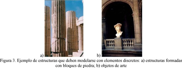 • Elementos Discretos. Este método es idóneo en el estudio de medios discontinuos, ya que permite el movimiento relativo entre elementos, así como el cambio de geometría la cual se calcula de forma automática. Un ejemplo de este tipo de estructuras son las construcciones formadas con bloques de piedra como columnas, esculturas, arcos, templos griegos o romanos (Fig. 3). Sin embargo, las características mecánicas de las juntas entre elementos son difíciles de evaluar; así como la solución numérica es lenta, debido a que considera cambios en la geometría.