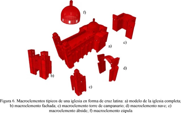 Cuando se analizan iglesias por sismo es común dividirlas en macroelementos. Los cuales se pueden definir como la parte de una iglesia cuya respuesta sísmica puede ser evaluada en forma independiente del resto de la estructura. De este modo se evita tener un modelo numérico de toda la iglesia, reduciendo así el costo computacional al tener modelos más pequeños de partes de la estructura original (Fig. 6). La idea de los macroelementos surge cuando se presentan mecanismos de daño. Éstos se forman cuando el daño en la estructura crea secciones con comportamientos similares al de cuerpos rígidos. De esta forma, el daño actúa en forma de articulación o desliga el elemento del resto de la estructura (Doglioni et al., 1994).