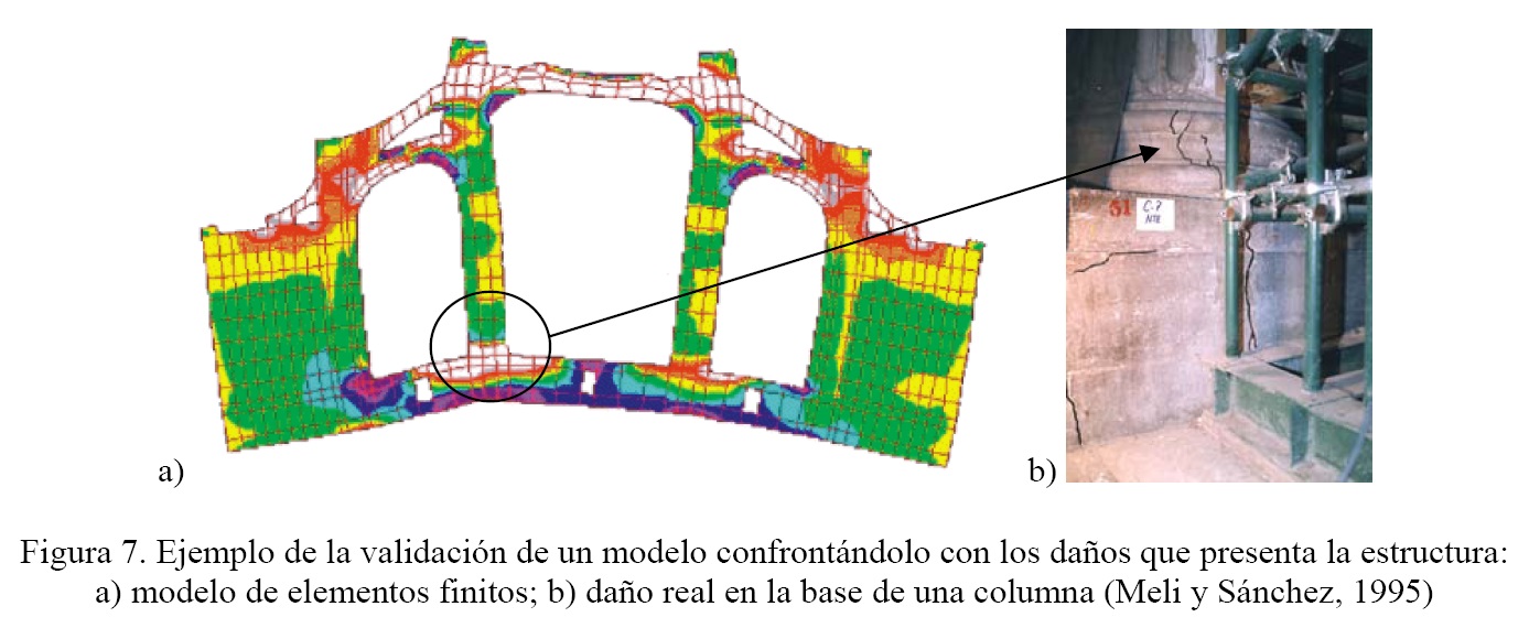 Por otro lado, considerando los daños presentes en la estructura por analizar, se puede hacer una calibración y validación del modelo de una forma cualitativa. Es decir, se puede validar el modelo al lograr reproducir los daños que presenta la estructura. Por ejemplo, la Figura 7 presenta un modelo de elementos finitos de una arcada de la Catedral de la ciudad de México, el cual fue sometido a una condición de hundimientos diferenciales. En este caso, se realizó la validación del modelo confrontándolo con los daños que presentaba el templo. Nótese que el agrietamiento real en la base de una columna debido a los hundimientos diferenciales, el cual coincide con las zonas de tensión (color blanco) que aparecen en el modelo, precisamente en la base de la columna (Meli y Sánchez, 1995).