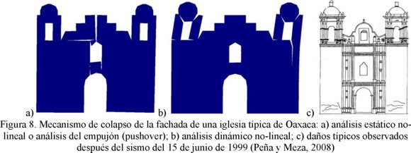 Para ejemplificar esto, considere el macroelemento fachada de una iglesia típica de Oaxaca analizada con un modelo de elementos rígidos (Peña y Meza, 2008). La Figura 8a muestra el mecanismo de colapso obtenido con un análisis estático no-lineal considerando fuerzas proporcionales a las masas de los elementos (análisis del empujón o pushover). El daño que se presenta es una grieta vertical que cruza la puerta y la ventana del coro, lo que provoca que la fachada se divida en dos. De este modo, cada torre permanece adosada a una parte de la fachada las cuales presentan una flexión generalizada. Por otro lado, el daño obtenido con un análisis dinámico no-lineal (Fig. 8b) se concentra en los campanarios, así como en el cuerpo de la torre. Estos últimos daños coinciden con los daños registrados en estas estructuras después del sismo del 15 de junio de 1999 (Fig. 8c).
