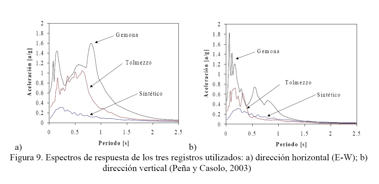 Un ejemplo de esto, es el estudio de la vulnerabilidad sísmica de una arcada de la Catedral de Noto, en Sicilia, Italia, (Fig. 4; Peña y Casolo, 2003), la cual fue sometida a tres registros diferentes, dos reales registrados en 1976 durante el sismo de Umbria - Marche, y uno sintético compatible con el espectro de diseño del Eurocódigo 8 (2004). La Figura 9 muestra los espectros de respuesta de estos registros.
