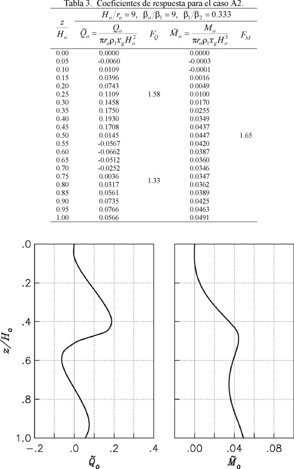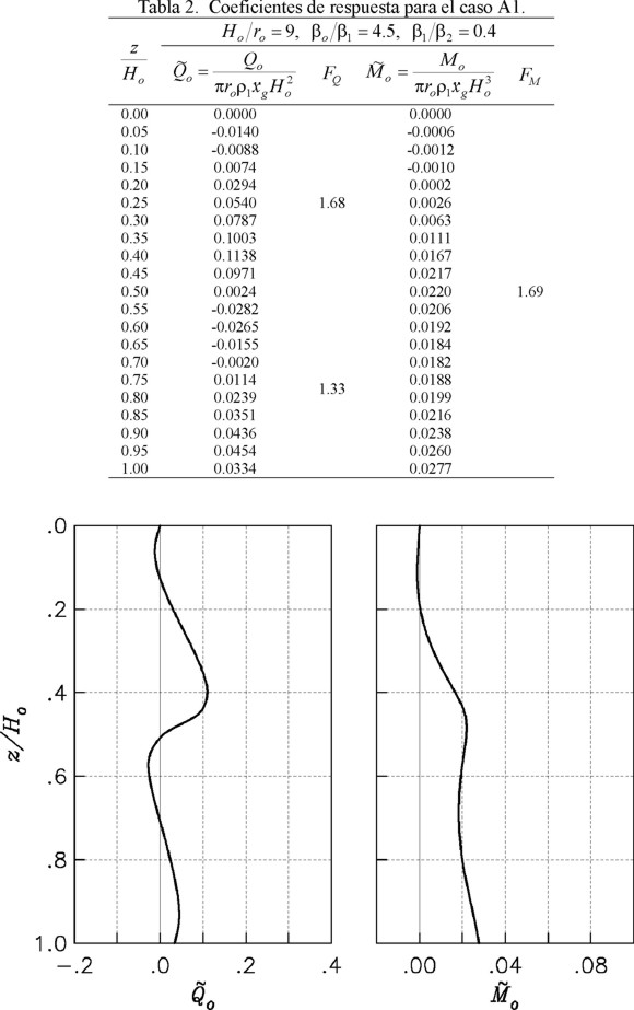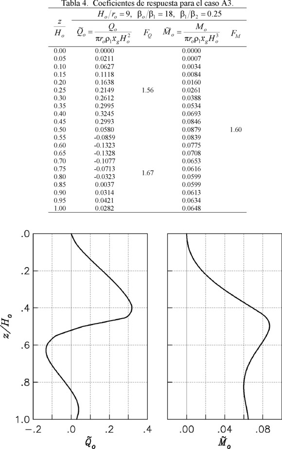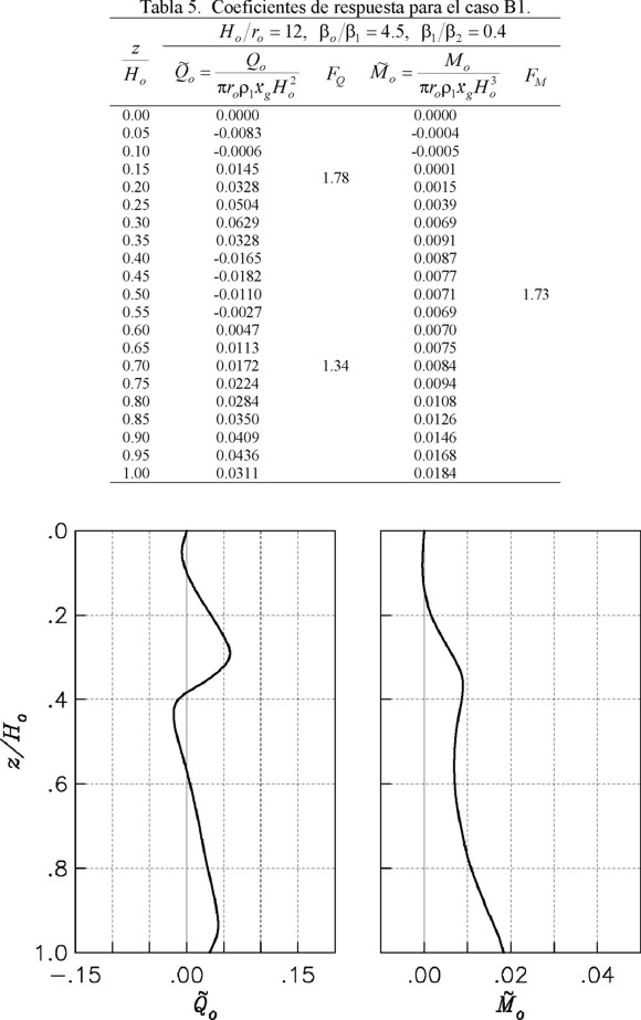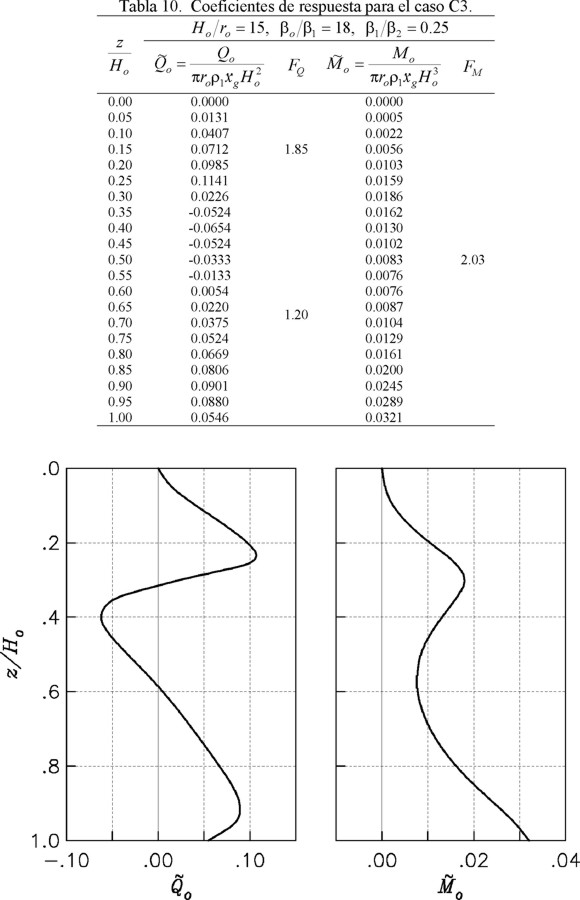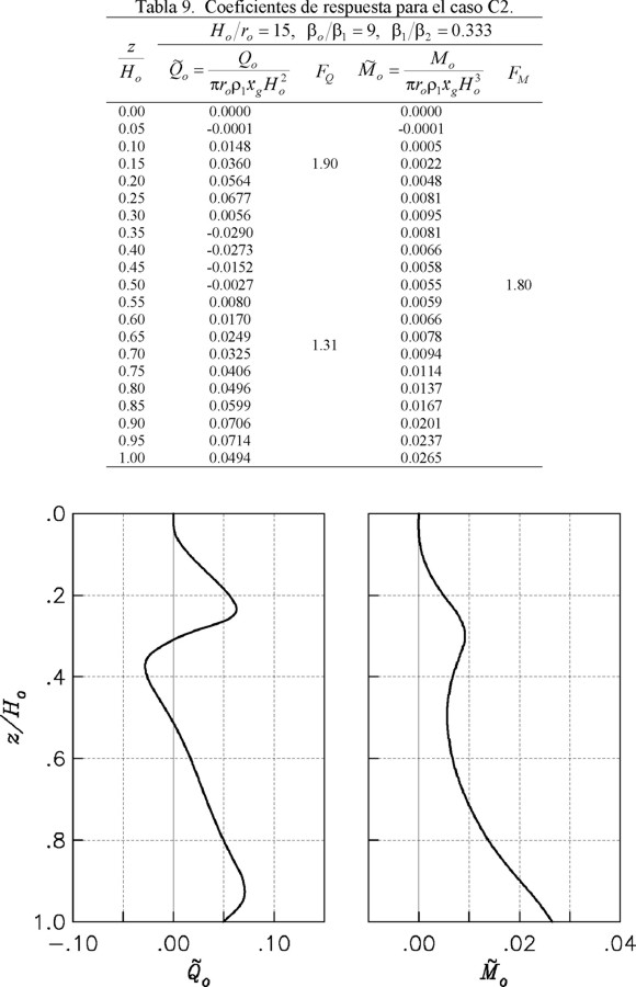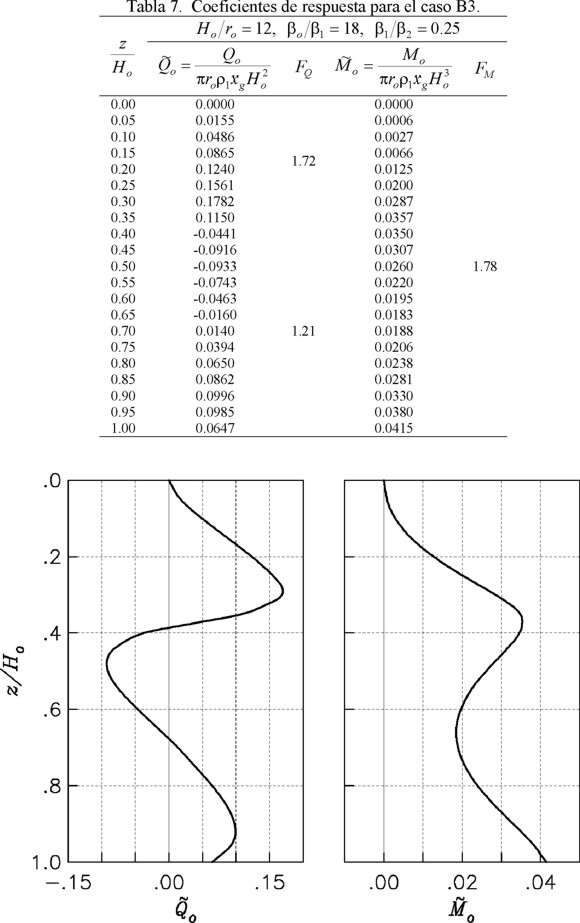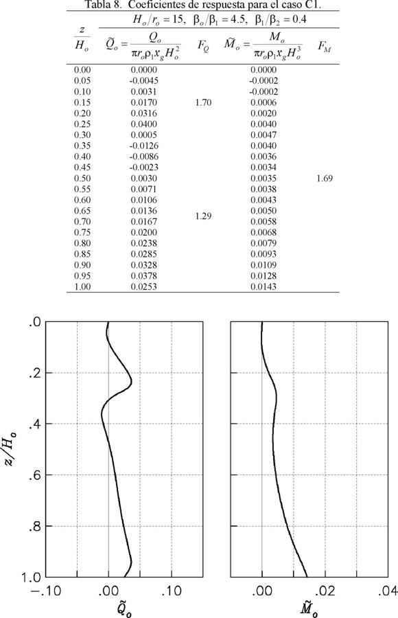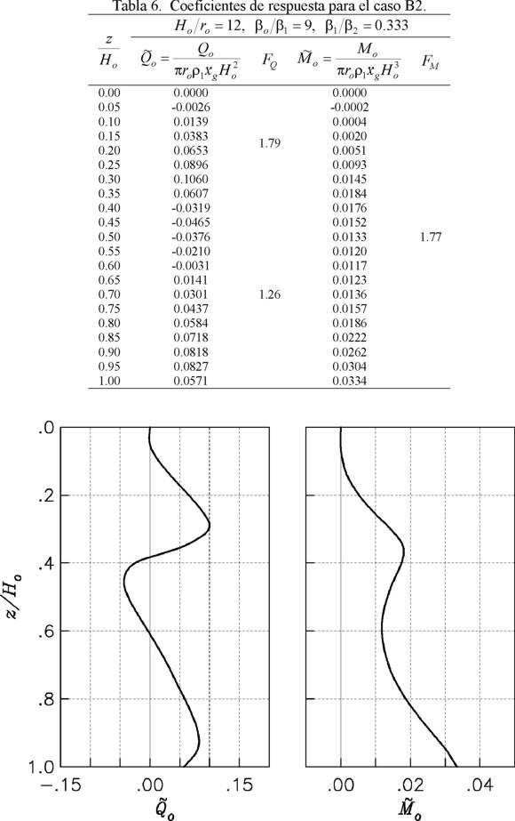 Como Ho/ro = 12 y βo/β1 = 9 se usa la tabla 6 para el caso B2. Para z/Ho = 1, el cortante y momento estáticos normalizados, así como los correspondientes factores de amplificación dinámica, son iguales a: