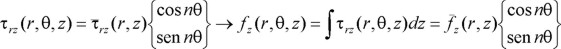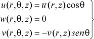 . De esta forma se demuestra que la descomposición azimutal de esfuerzos y fuerzas es idéntica a la de desplazamientos. La selección de la función azimutal, cos nθ o sen nθ, depende de la física del problema. Para excitación horizontal xg, sus componentes en coordenadas cilíndricas son ug = xg cos θ, wg = 0 y vg = −xg sen θ. En consecuencia, sólo se requiere del análisis de vibraciones simétricas para el número azimutal n = 1. Así, el problema tridimensional se reduce a uno bidimensional en el plano r − z.