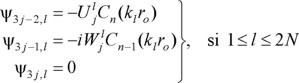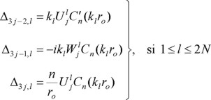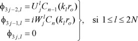 Los eigenvalores k1,..., k2N y k2N+1,..., k3N corresponden a modos generalizados de Rayleigh y Love, respectivamente. La condición de radiación en la región exterior se cumple usando Cn(klr) = Hn2(klr), que es la función de Hankel de segunda especie y orden n. Como se requieren modos evanescentes que decaigan con la distancia, éstos se seleccionan tal que Im[kl] < 0. Por otra parte, en la región interior debe usarse Cn(klr) = Jn(klr), que es la función de Bessel de primera especie y orden n. Para modos estacionarios, la selección del signo de kl es irrelevante; sólo se requiere que los modos correspondientes sean linealmente independientes.