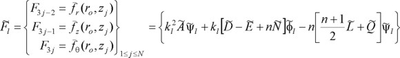 Las fuerzas nodales equivalentes en la superficie cilíndrica r = ro pueden obtenerse integrando los esfuerzos correspondientes con respecto a z, usando funciones de forma lineales. Estas fuerzas discretizadas están en equilibrio estático con los esfuerzos de estrato. Según Kausel y Roësset (1975 y 1977), el vector de fuerzas nodales consistentes para el modo 1 ≤ l ≤ 3N es