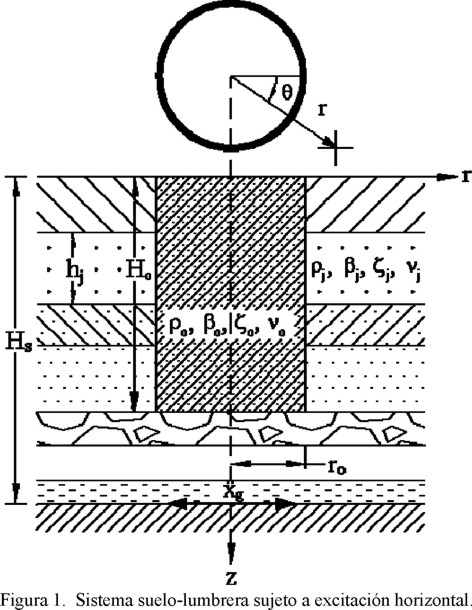 En la fig. 1 se muestra el sistema suelo-lumbrera investigado. Sean u , v y w los desplazamientos radial, tangencial y axial, respectivamente, en coordenadas cilíndricas (r, θ, z). Si el sistema se subdivide en N estratos horizontales, las ecuaciones diferenciales que gobiernan el movimiento armónico en el estrato 1 ≤ j ≤ N son