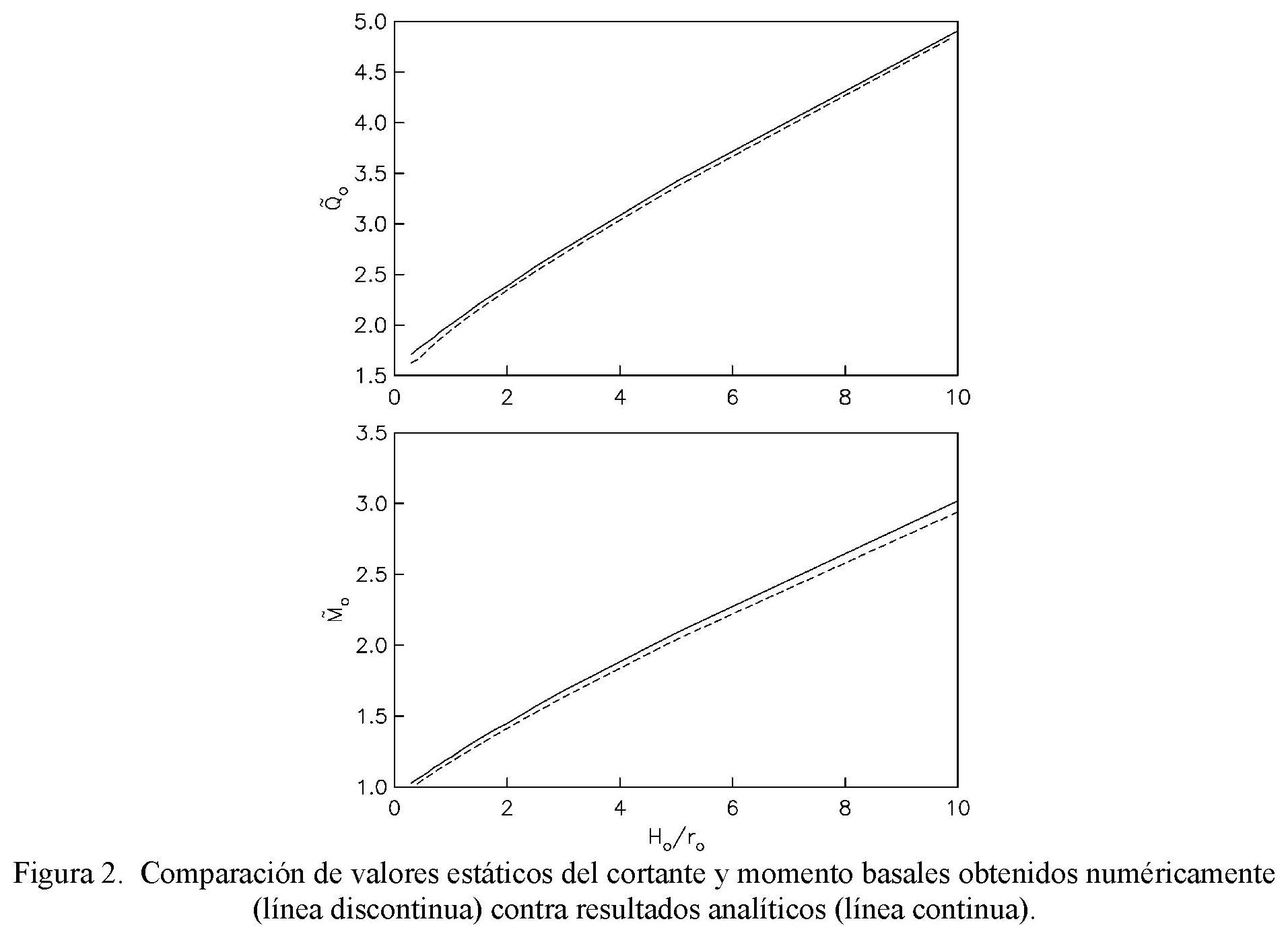 basales, normalizados con respecto a πroρsxgHo2 y πroρsxgHo3, respectivamente. Los valores estáticos corresponden a una excitación armónica cuya frecuencia es mucho menor que la frecuencia fundamental del estrato. Si la base del estrato se considera fija, la excitación estática se representa por fuerzas de cuerpo laterales de intensidad −ρsxg para el suelo y −ρoxg para la estructura. Los efectos resultantes no deben confundirse con los efectos estáticos debidos a cargas de gravedad.