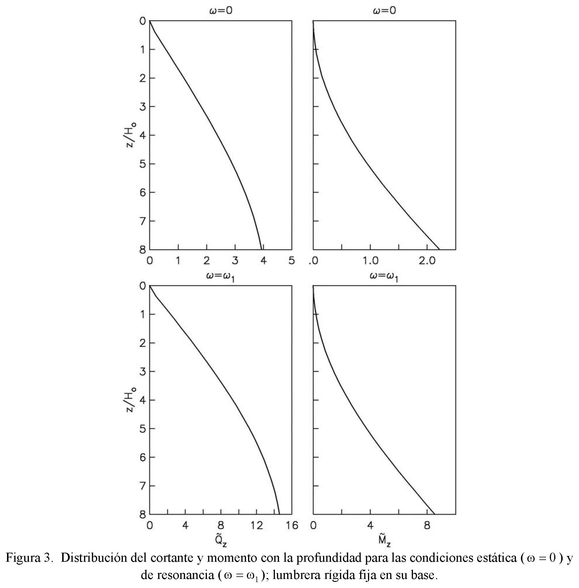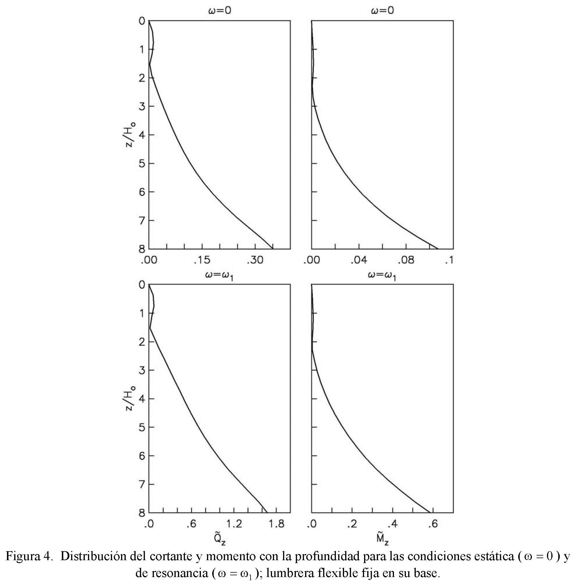 con la profundidad normalizada z/Ho, para los casos de lumbrera rígida (βs/βo = 0) y lumbrera flexible (βs/βo = 0.2), respectivamente. Se han considerado los siguientes valores de los parámetros del sistema: Ho/ro = Hs/ro = 8, νo = 0.25, νs = 0.45 y ζo = ζs = 0.05; el espesor del muro es de 1 m. Los resultados que se grafican son para las frecuencias de excitación ω = 0 (respuesta estática) y ω1 = πβs/2Hs (respuesta resonante). Se observa que el efecto de la flexibilidad del muro reduce extraordinariamente la magnitud del cortante y momento, a la vez que altera su distribución con la profundidad debido a la participación de los modos superiores del suelo. Como las respuestas estática y resonante tienen formas muy parecidas, es de esperarse un comportamiento similar para la respuesta sísmica.