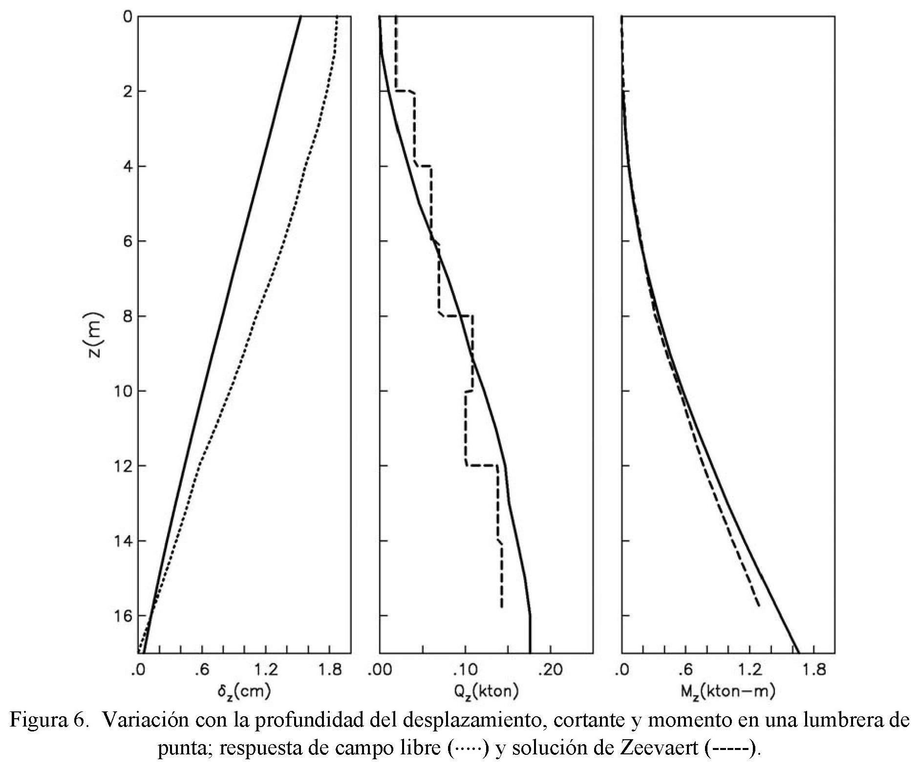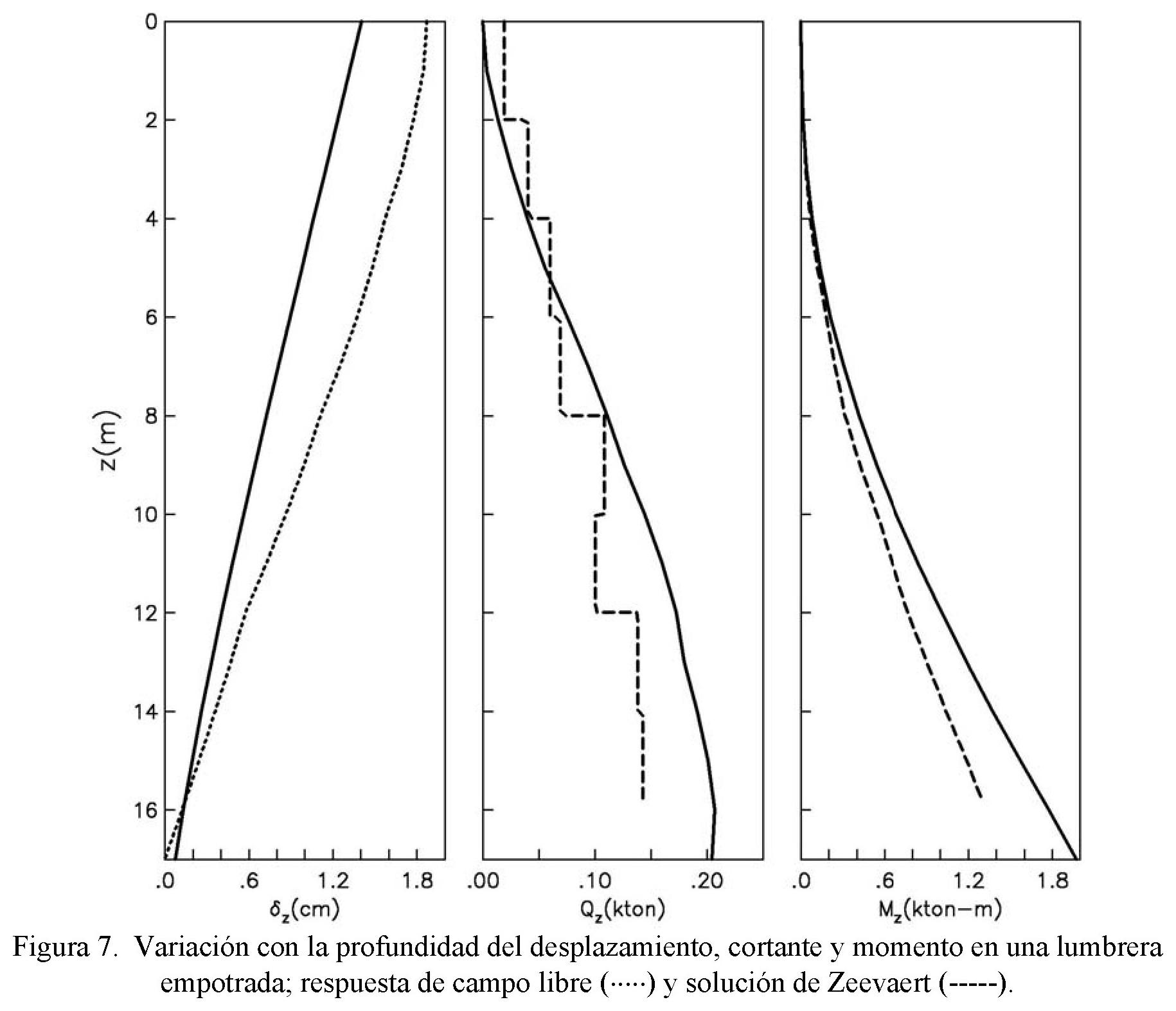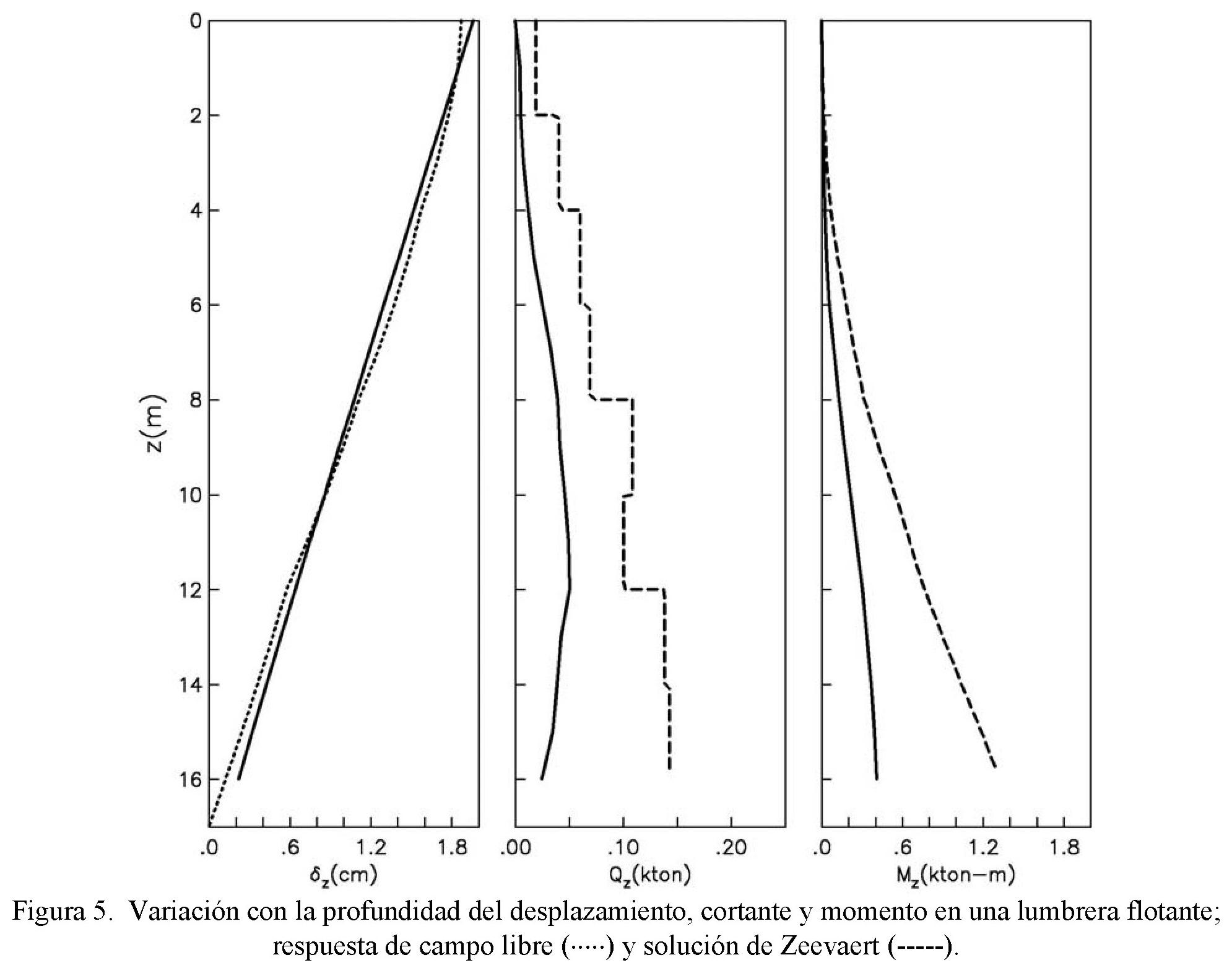 Obsérvese que el desplazamiento relativo de la lumbrera flotante tiende a seguir el desplazamiento del terreno y así se desarrollan los menores elementos mecánicos. Para los otros casos se reduce significativamente el desplazamiento relativo de la lumbrera, debido a la restricción del movimiento de su base al apoyarse o enterrarse en el basamento. La reducción del desplazamiento se traduce en un incremento de las acciones del suelo comparadas con las generadas en la lumbrera flotante. Este incremento es mayor a medida que se rigidiza la condición de apoyo. La solución de Zeevaert se ajusta muy bien a los resultados de la lumbrera de punta.