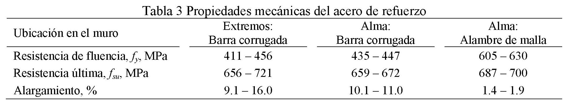 En las tablas 2 y 3 se presentan los valores promedio de las principales propiedades mecánicas del concreto y del acero de refuerzo en el alma del muro, respectivamente. Para el concreto, estas propiedades fueron obtenidas en una fecha cercana al ensayo de los modelos. La resistencia nominal a la compresión del concreto fue igual a 15 MPa y la resistencia nominal de fluencia de las barras corrugadas y los alambres de malla fueron 412 y 491 MPa, respectivamente.