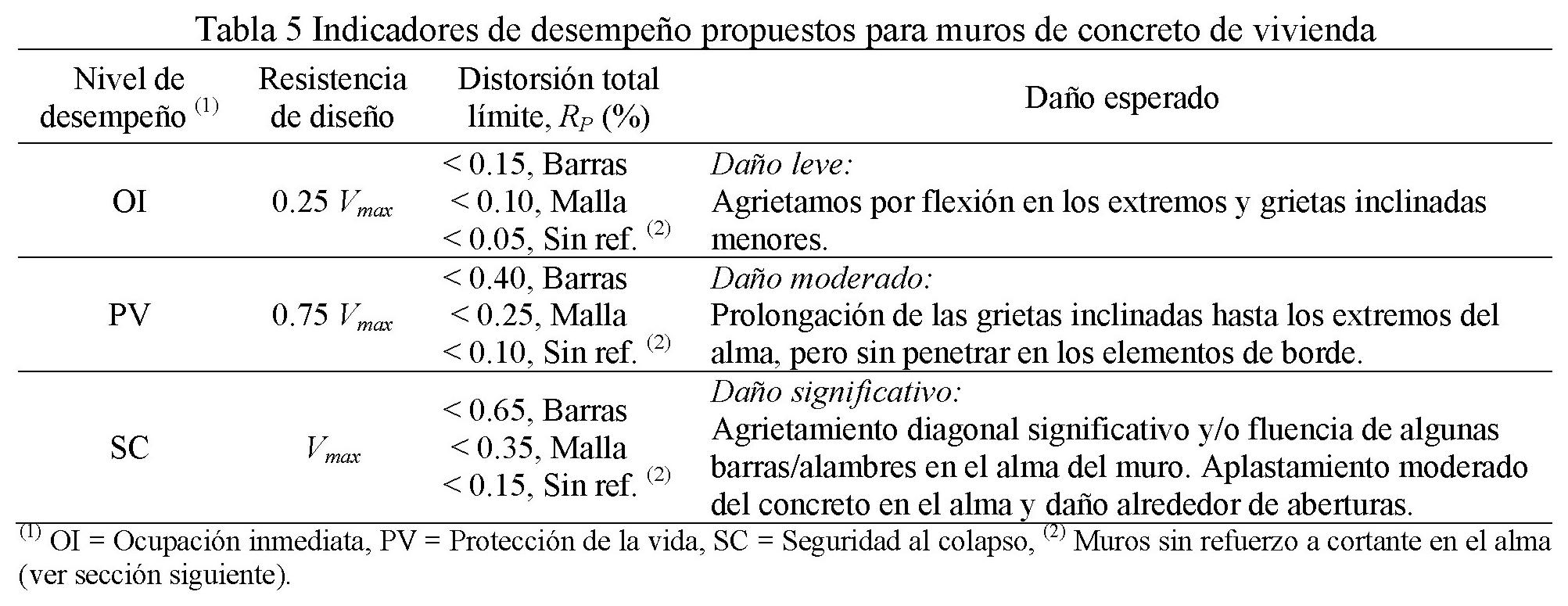 Con el propósito de evaluar el daño en los muros de concreto en viviendas de baja altura, cuyo comportamiento está gobernado por cortante, los indicadores de desempeño se establecieron con base en límites de distorsión permisible de entrepiso (RP). Para establecer los valores RP, inicialmente se implantaron las resistencias de diseño para cada nivel de desempeño. Para DSBD de muros de concreto con las características particulares de viviendas de baja altura se propone seleccionar tres niveles de desempeño sísmico o estados de daño (tabla 5): a) ocupación inmediata (OI), b) protección de la vida (PV) y, c) seguridad al colapso (SC). Los niveles de desempeño de OI y PV están asociados al desarrollo del 25% y 75%, respectivamente, de la resistencia (0.25 Vmax y 0.75 Vmax). El nivel de desempeño de SC está asociado al desarrollo de la resistencia a cortante del muro (Vmax) (Carrillo, 2010a). Como se muestra en la tabla 5, en este caso, los valores seleccionados son iguales a los propuestos por Sánchez (2010). Luego se establecieron los valores límite de distorsión total asociados a las resistencias de diseño definidas. Los valores se determinaron utilizando las curvas de histéresis medidas en los ensayos dinámicos y cuasi-estáticos. En seguida se estableció de forma cualitativa el daño esperado, a partir del daño observado durante los ensayos dinámicos de los muros.