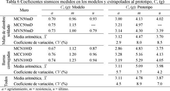 En esta sección se compara la demanda y la capacidad resistente de viviendas en términos del coeficiente sísmico (Cs), el cual se emplea para representar la demanda sísmica de resistencia para fines de diseño reglamentario. La capacidad se determinó a partir de los resultados medidos en los ensayos dinámicos en mesa vibradora (Carrillo, 2010a). En la tabla 6 se presentan los coeficientes sísmicos medidos en los modelos, para tres estados límite: agrietamiento (a), resistencia (m) y último (u). En la tabla se muestran, por separado, los resultados para los muros reforzados con malla de alambre soldado y para los muros reforzados con barras corrugadas. Para extrapolar los valores al prototipo se aplicó el factor de similitud de aceleración, modificado a partir de las relaciones de masa en el modelo y en el prototipo (Carrillo, 2010a). Además, se calculó el promedio de los coeficientes sísmicos en el prototipo para cada uno de los estados límite, de acuerdo con el tipo de refuerzo en el alma de los muros. A pesar de que los muros con malla de alambre soldado fueron reforzados con 50% de la cuantía mínima de refuerzo a cortante estipulada en las NTC-C (2004) y, los muros con barras corrugadas con el 100% de dicha cuantía, los valores del coeficiente sísmico en el prototipo fueron notablemente similares (tabla 6).