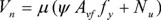 Para los muros de las características estudiadas, se plantea incluir el factor ψ en las ecuaciones de la sección 2.5.10 de las NTC-C (2004). Por tanto, se propone que la resistencia al cortante por fricción esté asociada al menor de los valores calculados con las ecuaciones 5 a 7. En dichas ecuaciones, A es el área de la sección definida por el plano crítico, Avf es el área total de refuerzo de cortante por fricción, fy es el esfuerzo especificado de fluencia del acero de cortante por fricción (para el diseño, fy ≤ 412 MPa), Nu es la fuerza de diseño de compresión normal al plano crítico, μ es el coeficiente de fricción que se toma como 1.4 para concreto colado monolíticamente, 1.0 para concreto colado contra concreto endurecido y, ψ representa la eficiencia del refuerzo a cortante por fricción y es igual a 0.45.