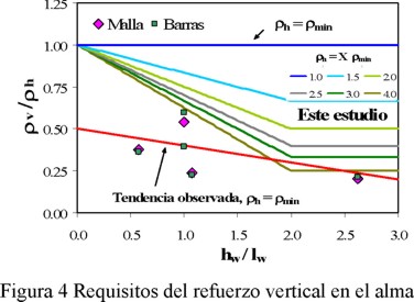 Para garantizar distribución uniforme de grietas diagonales, es necesario proporcionar una cuantía mínima de refuerzo vertical en el alma, la cual depende principalmente de la cuantía de refuerzo horizontal y de la relación de aspecto del muro. Con base en las deformaciones medidas en el acero de refuerzo vertical del alma del muro, se propone calcular dicha cuantía a partir la ecuación 3, cuyos resultados se ilustran en la figura 4 ("Este estudio").