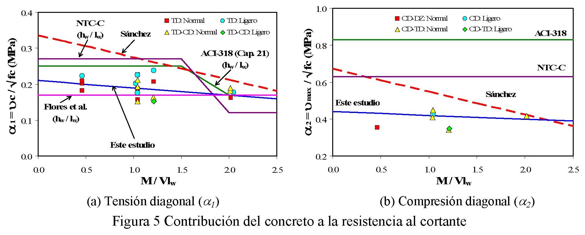 En la ecuación 1, el límite superior representa la resistencia que puede desarrollar el muro antes de que se origine falla por compresión diagonal. En este límite, el factor α2 relaciona la contribución máxima del concreto a la resistencia al cortante por compresión diagonal y la raíz cuadrada de la resistencia a la compresión del concreto. Las fallas por compresión diagonal se presentan principalmente en: a) muros con altas cuantías de refuerzo a cortante, las cuales impiden que el refuerzo experimente deformaciones plásticas y, b) muros con resistencias a la compresión del concreto bajas o en muros de concreto agrietados. A partir de las tendencias observadas de los resultados experimentales, para propósitos de diseño sísmico de viviendas con las características estudiadas, se propone calcular los factores α1 y α1 por medio de la ecuación 4. Los valores aquí propuestos se indican en la figura 5 ("Este estudio"), junto con las metodologías de otros estudios y reglamentos.