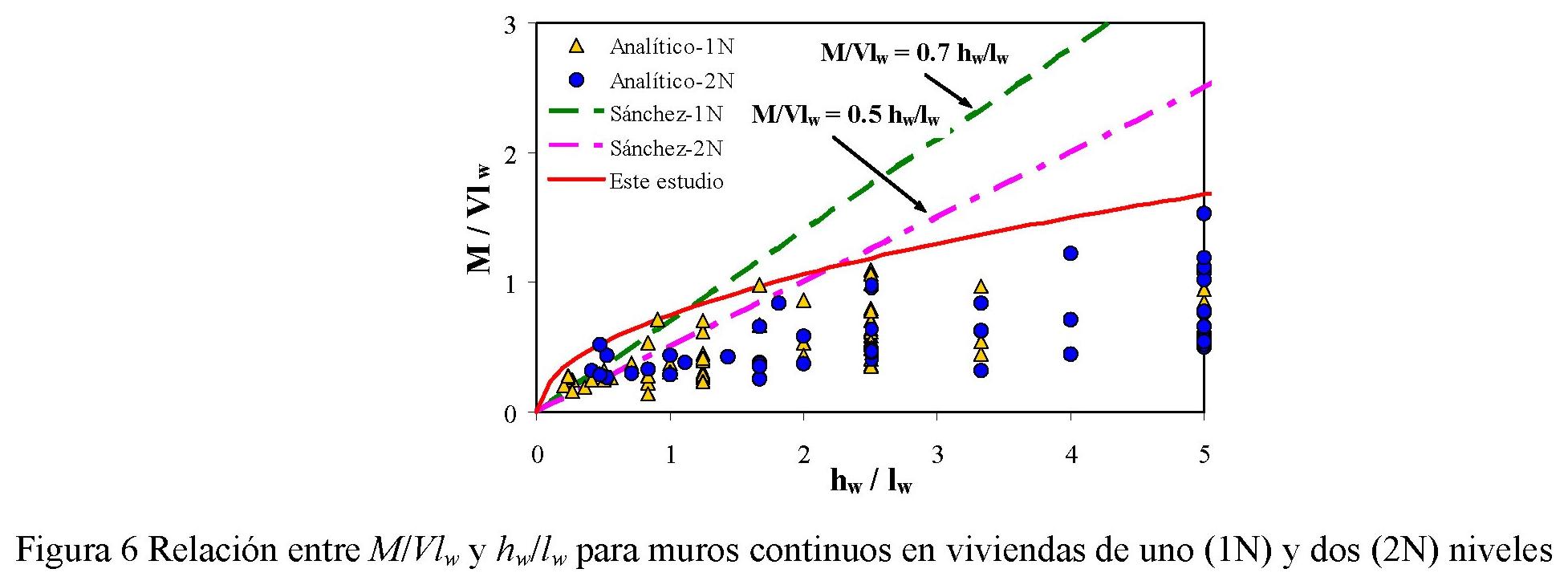 Las ecuaciones del modelo de predicción aquí propuesto dependen del cociente M/Vlw; es decir, el cociente entre el momento de flexión (M) y el producto de la fuerza cortante por la longitud del muro (Vlw). Si en muros ensayados en voladizo la carga se aplica a una altura igual a la altura del muro (hw), la relación de aspecto (hw/lw) es igual al cociente M/Vlw Sin embargo, en muros con nivel de acoplamiento común, hw/lw es usualmente mayor que M/Vlw. Para el diseño sísmico de viviendas de baja altura, M y V representan el momento y el cortante de diseño en la base del muro. Por tanto, el valor del cociente M/Vlw se debe obtener utilizando los parámetros calculados durante el proceso de diseño sísmico. A partir de los resultados del análisis y diseño de ocho prototipos de viviendas de uno y dos niveles ubicados en diferentes zonas de la República Mexicana (Carrillo, 2010a), se calculó el valor del cociente M/Vlw asociado a cada muro con relación de aspecto conocida (hw/lw). En la figura 6 se indica cada pareja de datos para las viviendas de uno (Analítico-1N) y dos niveles (Analítico-2N) y, se incluye la propuesta de Sánchez (2010). En la figura se observa que no existe una diferencia evidente entre las tendencias para muros en viviendas de uno y dos niveles.
