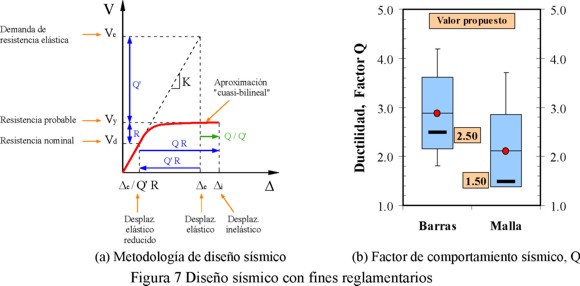 Por razones básicamente económicas, es impráctico pretender que las estructuras resistan los grandes temblores sin rebasar su intervalo de comportamiento elástico. Por tanto, los criterios vigentes de diseño admiten que la estructura experimente incursiones en el intervalo no-lineal ante el sismo que caracteriza el estado límite de colapso. Esto permite limitar las demandas de fuerza en los elementos estructurales (utilizar resistencias de diseño menores), a cambio de que se presenten demandas de ductilidad limitadas y cierto nivel de daños provocados por la fluencia de algunas secciones de la estructura. En la mayoría de los reglamentos, las fuerzas sísmicas de diseño se reducen en función de la capacidad de ductilidad de las estructuras, utilizando el factor de reducción por ductilidad que se denota como Q'[figura 7(a)]. Sin embargo, no todo el exceso de la capacidad estructural real ante sismo con respecto a la calculada se debe a comportamiento dúctil. La mayoría de las estructuras cuenta con reservas extras de capacidad ante carga sísmica no consideradas en el diseño convencional, las cuales hacen que la estructura tenga una sobrerresistencia (MDOC-CFE, 2008). La opción más práctica de tomar en cuenta este efecto, consiste en aplicar un factor reductor, R, del lado de las acciones.