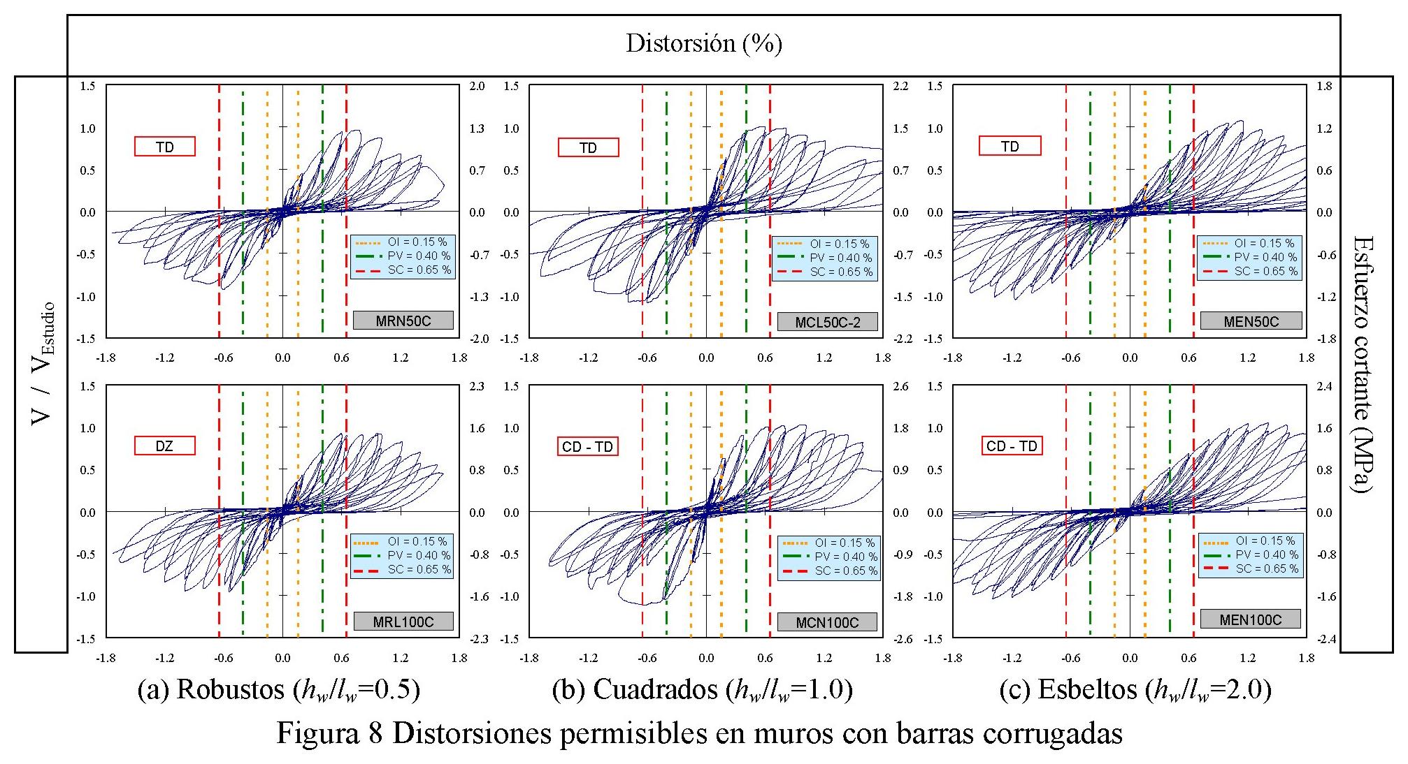 A partir de las curvas de histéresis medidas, para los tres niveles de desempeño definidos se proponen los valores límite de distorsión que se indican en la tabla 5, los cuales dependen del tipo de refuerzo a cortante en el alma. Los valores propuestos se muestran en las figuras 8 y 9. Se estableció un solo valor para muros con barras corrugadas, ya que no se observaron diferencias significativas entre los muros con las dos cuantías de refuerzo a cortante estudiadas. Como se observa en la tabla 4, para el nivel de desempeño de seguridad al colapso, el valor aquí recomendado para muros de concreto reforzados en el alma con barras corrugadas (RP(SC)=0.65%) es menor que el valor especificado en NTC-C (2004) para muros que no cumplen los requisitos para muros dúctiles (RP(SC)=1.0%), y es un poco mayor que el valor estipulado en NTC-M (2004) para muros de mampostería de piezas macizas confinada con castillos y dalas, con refuerzo horizontal o malla (RP(SC)=0.50%). Para muros de concreto reforzados en el alma con malla de alambre soldado, el valor aquí recomendado (RP(SC)=0.35%) es un poco menor que el valor estipulado en NTC-M para muros de mampostería reforzada de piezas multiperforadas confinada con castillos exteriores (RP(SC)=0.40%). Para el nivel de desempeño de ocupación inmediata, NTC (2004) y MDOC-CFE (2008) especifican dos valores de RP(OI) sin tomar en cuenta de forma directa el tipo de sistema estructural; es decir, los valores dependen exclusivamente de la presencia de elementos incapaces de soportar deformaciones apreciables (0.20% o 0.40%, tabla 4). Los valores aquí propuestos son menores que los estipulados en dichos reglamentos; es decir, RP(OI)=0.10% para muros de concreto reforzados en el alma con malla de alambre soldado y RP(OI)=0.15% para muros reforzados con barras corrugadas.