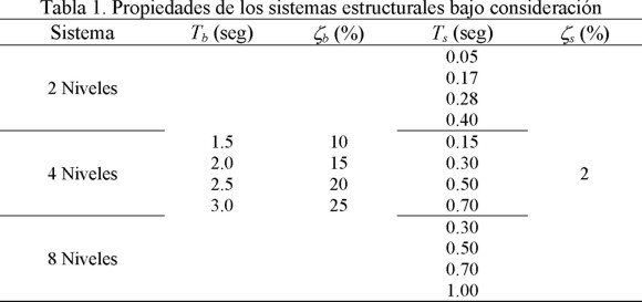 Una medida que caracteriza a los sistemas estructurales en el presente trabajo es la relación de rigideces laterales que exhiben el sistema de aislamiento y su super-estructura (Tb/Ts), donde Tb es el periodo fundamental que exhibiría el sistema aislado si toda su masa se concentrará en la base, y Ts es el periodo fundamental de la super-estructura sobre base rígida. La tabla 1 resume las propiedades estructurales y dinámicas de los sistemas de dos, cuatro y ocho niveles bajo consideración. ζb y ζs son los porcentajes de amortiguamiento crítico asignados al sistema de aislamiento y a la super-estructura, respectivamente. Es importante destacar que aunque las super-estructuras de ocho niveles salen del alcance planteado para este artículo (estructuras de baja altura), se incluyen sus resultados para aportar al lector un panorama más amplio a partir del cual le sea posible entender las particularidades que se dan alrededor de las estructuras aisladas de baja altura. En este sentido, los resultados de dos y ocho niveles aquí reportados sólo representan una medida de comparación con respecto a las estructuras de interés (cuatro niveles).