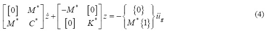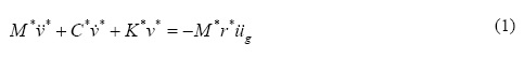 donde M*, C* y K* son las matrices de masa, amortiguamiento y rigidez del sistema aislado, respectivamente; v* es el vector de desplazamientos relativos al sistema de aislamiento; r* es un vector de acoplamiento que relaciona los grados del sistema estructural con la aceleración del terreno; y üg es la aceleración del terreno.