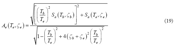 donde Ae es la demanda de aceleración absoluta para contenidos elásticos con bajo amortiguamiento; Sa es la ordenada espectral de pseudo-aceleración; Te y Tb son los periodos del contenido y del sistema de aislamiento considerado como un sistema de un grado de libertad, respectivamente; y ζe y ζb son los porcentajes de amortiguamiento crítico correspondientes al contenido y sistema de aislamiento, respectivamente.