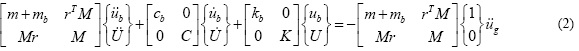 donde m es la masa total de la super-estructura; mb, cb y kb son la masa, el amortiguamiento y la rigidez del sistema de aislamiento, respectivamente; M, C y K son las matrices de masas, amortiguamiento y rigidez, respectivamente, de la super-estructura sobre base rígida; r es un vector de unos; ub es el desplazamiento medido en el nivel de aislamiento; y U es el vector de desplazamientos de la super-estructura medidos respecto al desplazamiento del sistema de aislamiento. El sistema matricial resumido en la ecuación 2 contempla N ecuaciones.
