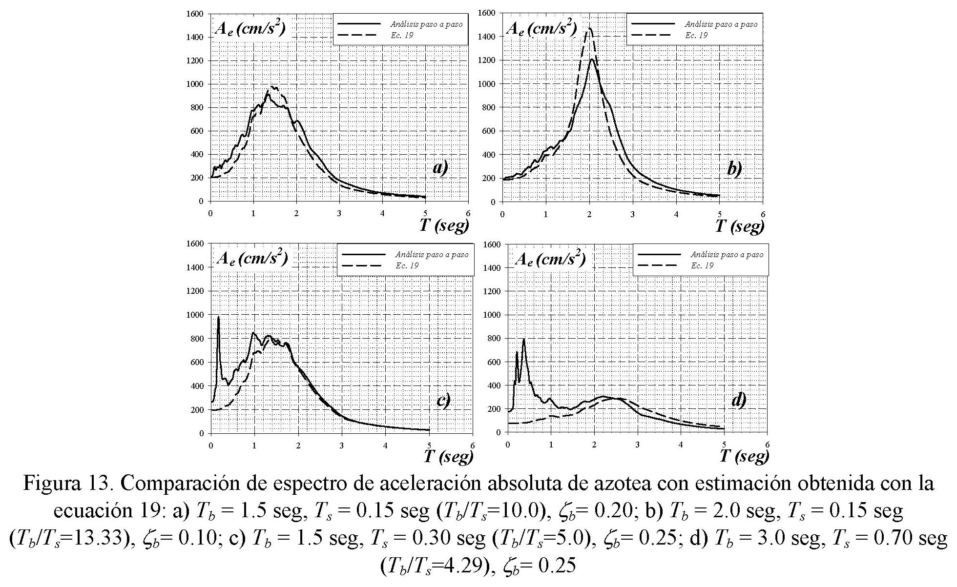 La figura 13 compara espectros de piso de aceleración con sus respectivas estimaciones obtenidas a partir de la ecuación 19. Conforme a lo esperado, se obtiene una buena aproximación para las demandas de aceleración para sistemas con relaciones de Tb/Ts mayores que diez. En el caso de super-estructuras flexibles, Tb no representa una buena forma de estimar el periodo fundamental de vibración de la estructura aislada (conforme lo ilustra la diferente localización de los picos en la figura 13d), y la ecuación 19 subestima, como se muestra en las figuras 13c y 13d, las demandas de aceleración para los contenidos que caen en el rango corto de periodos. Los resultados resumidos en las figuras 13a y 13b confirman el hecho de que un sistema estructural aislado se comporta como un sistema de un grado de libertad siempre y cuando se asigne una rigidez lateral lo suficientemente elevada a su super-estructura.