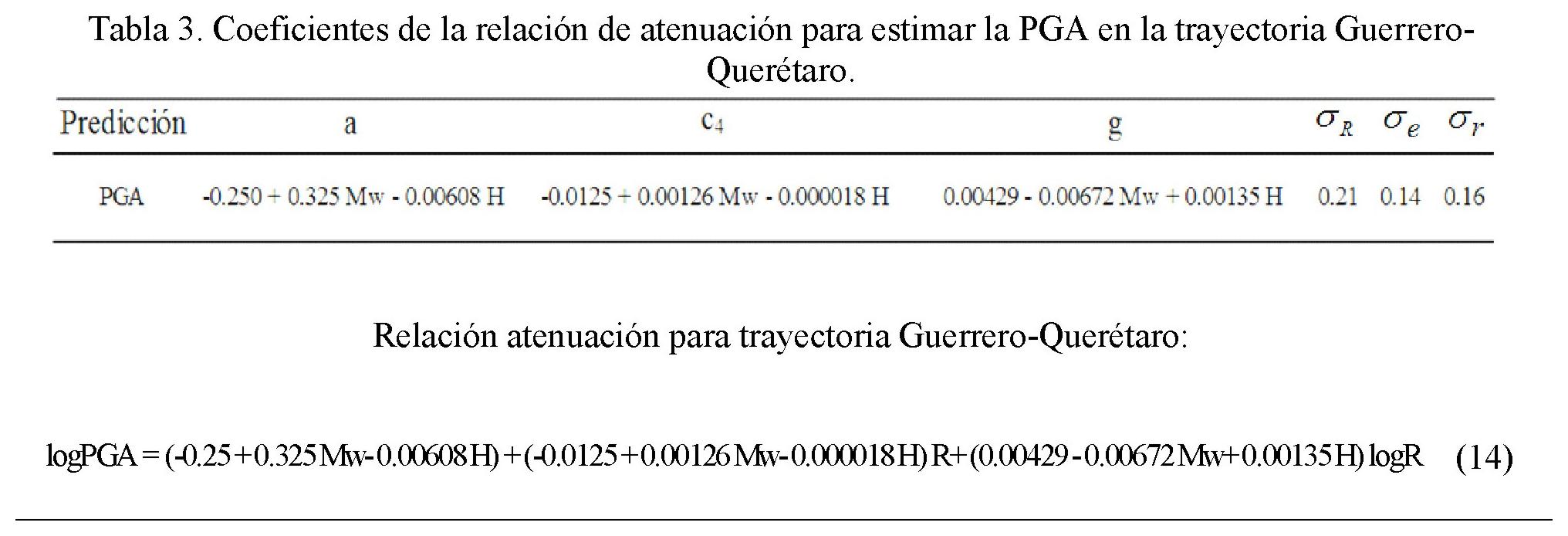 2. Posteriormente, en una segunda etapa se obtuvieron los coeficientes mostrados en la tabla 3, donde es posible reconocer el nivel de dependencia con la magnitud Mw y profundidad H. Estos coeficientes determinan la forma general de la relación de atenuación (ecuación 9) y definen la relación de atenuación para la trayectoria Guerrero-Querétaro (ecuación 14).