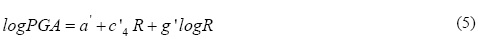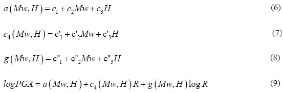 En las relaciones anteriores, PGA es el promedio cuadrático de la aceleración máxima de las dos componentes horizontales de cada registro de aceleración del suelo (en cm/s2 ≈ Gal), Mw es la magnitud de momento sísmico (Kanamori, 1977), R es la distancia hipocentral (en km), H representa la profundidad focal (en km); a', a, ci, ci', ci', g' y g, son los coeficientes de la relación de atenuación.