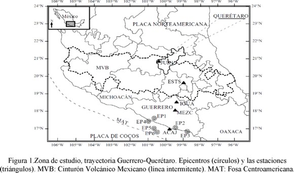 La recopilación de datos sísmicos recientes ha permitido disponer de 16 registros correspondientes a 6 sismos. Sus respectivos epicentros se pueden ver en el mapa de la figura 1. Todos los sismos tienen epicentro en la zona de subducción de la costa de Guerrero, México. Las características más relevantes de los sismos seleccionados se muestran en la tabla 1. Para la selección de estos datos se tomó en cuenta la trayectoria con dirección a la zona de Querétaro, cruzando el MVB. Se consideraron las características de la fuente sísmica y formas de ecuaciones que describen las curvas de atenuación utilizadas por otros autores (e.g., Joyner y Boore, 1981; Ordaz et al., 1989; Atkinson y Boore, 2003; García, 2006) con la finalidad de comparar y complementar los resultados de este estudio.