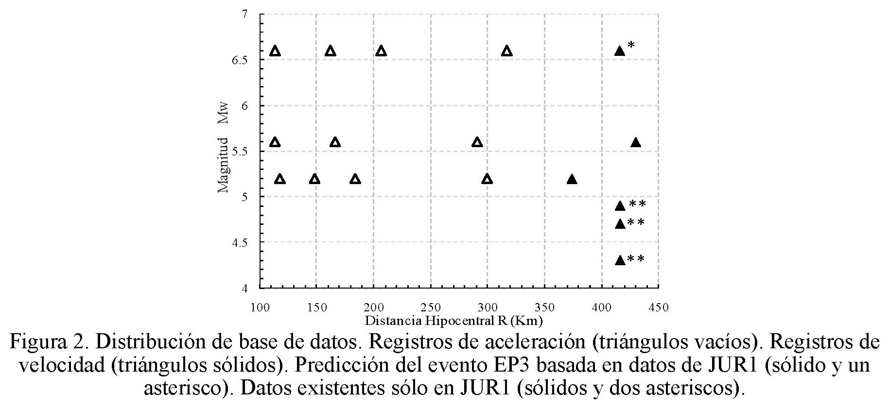 Posterior a este proceso, se calcularon los promedios cuadráticos de la aceleración máxima de las dos componentes horizontales de cada registro con base en la ecuación 1, que representan la PGA en este trabajo. Las distancias hipocentrales (R) se estimaron directamente con las coordenadas geográficas (utilizando principios básicos de geometría) a partir de la profundidad (H) para cada evento. Es importante mencionar que debido a la calidad de datos en la estación JUR1 (sismógrafo de banda ancha), el procesamiento de los registros requirió un menor tratamiento (aplicación de correcciones de línea base y filtros), en comparación a estudios pasados con datos analógicos que incluían numerosos filtros y correcciones, los cuales afectan de alguna forma los resultados (García, 2001).