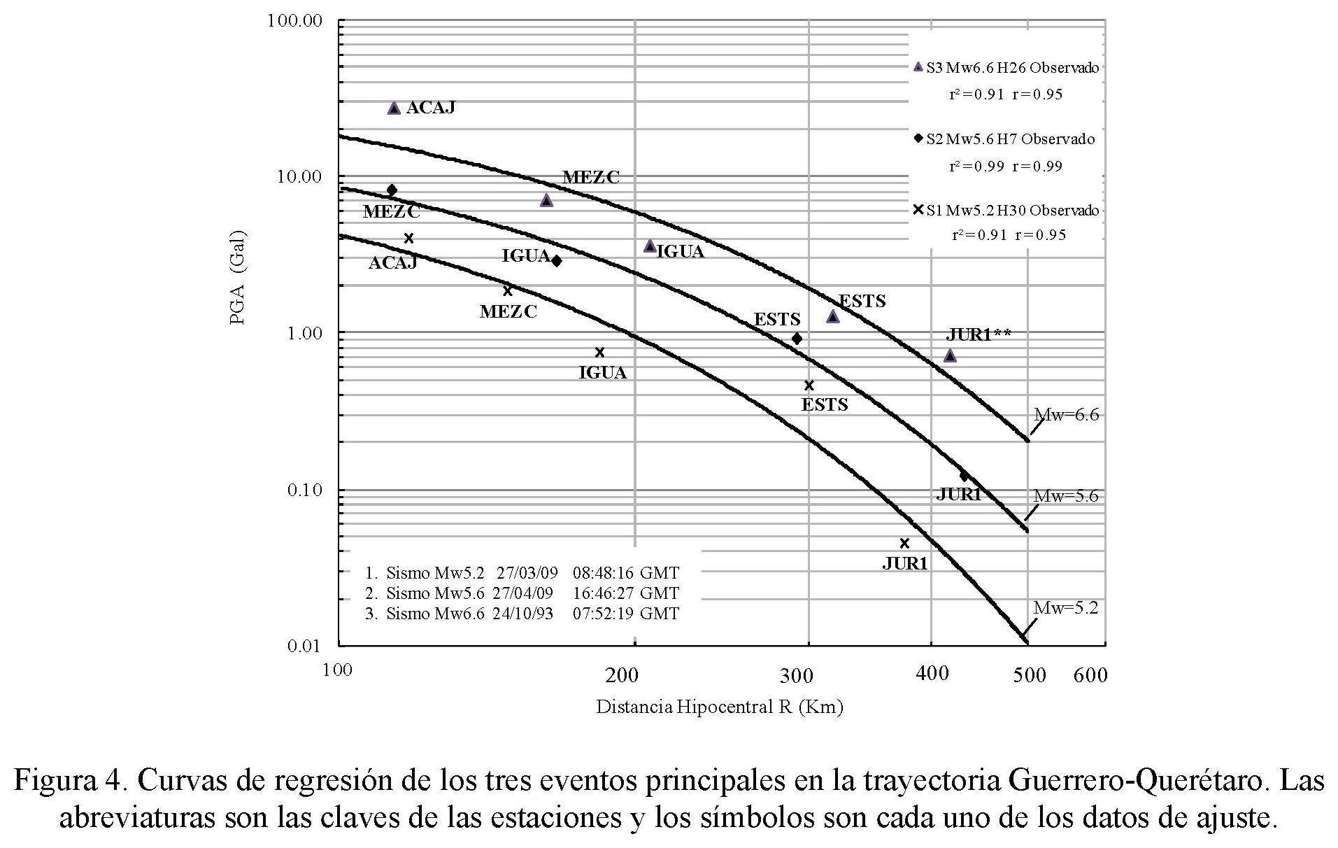 1. Se efectuaron las tres primeras regresiones (primer etapa), para los tres eventos en la trayectoria Guerrero-Querétaro, con muy buenos índices de correlación y determinación (ver figura 4), obteniendo las tres siguientes ecuaciones: