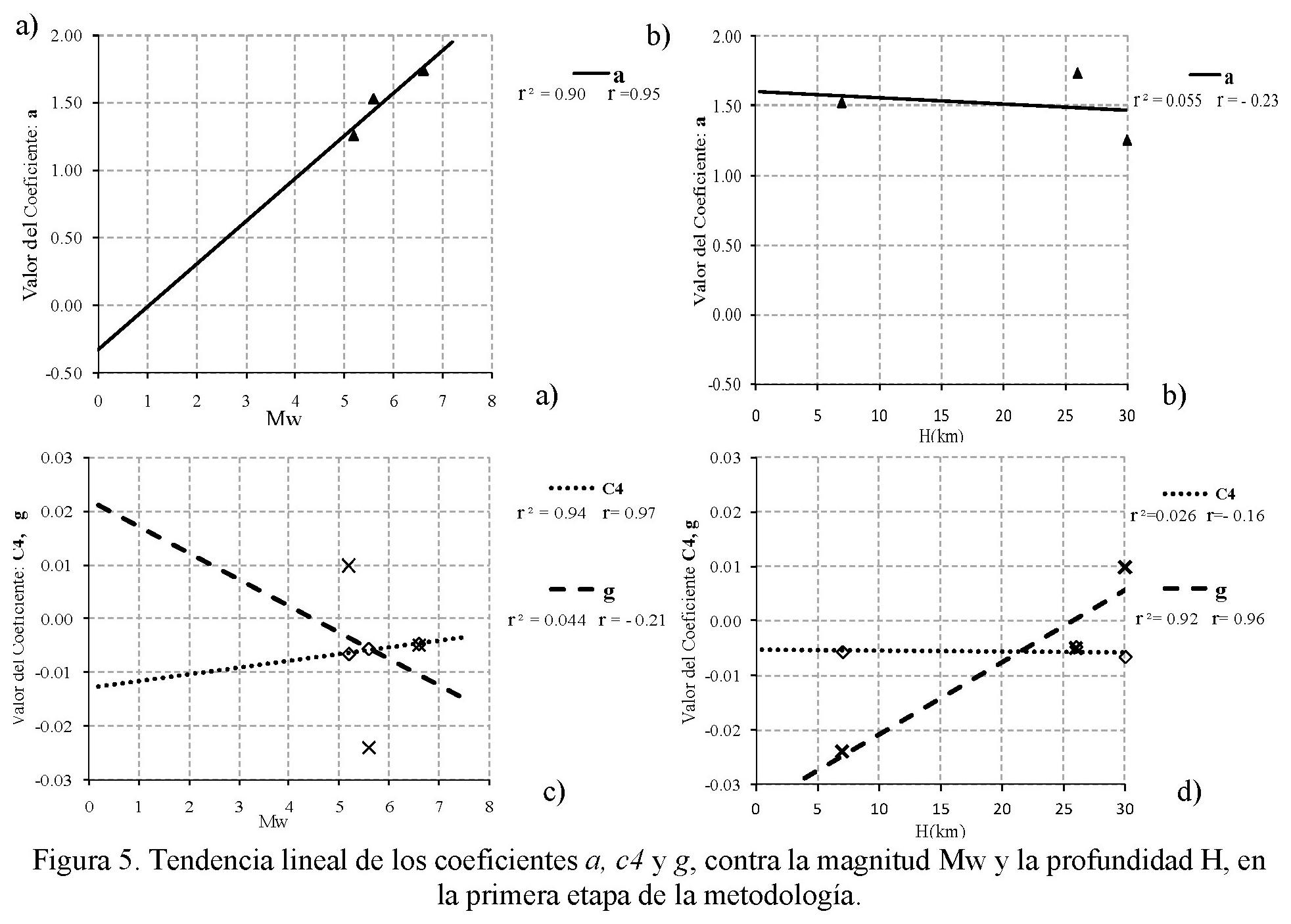Del punto uno, se determinó la tendencia y el nivel de significancia para cada coeficiente, como función de la magnitud Mw y la profundidad H (figura 5).