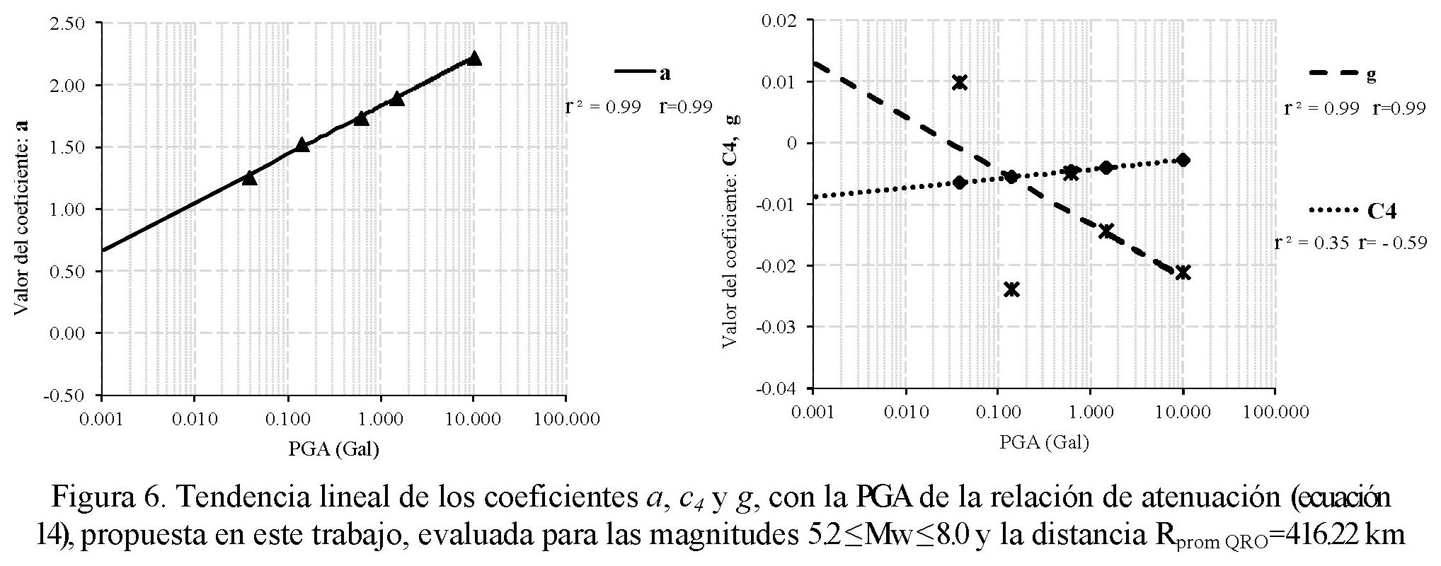 2. Tendencia de cada uno de los coeficientes a, c4 y g en función de la PGA.