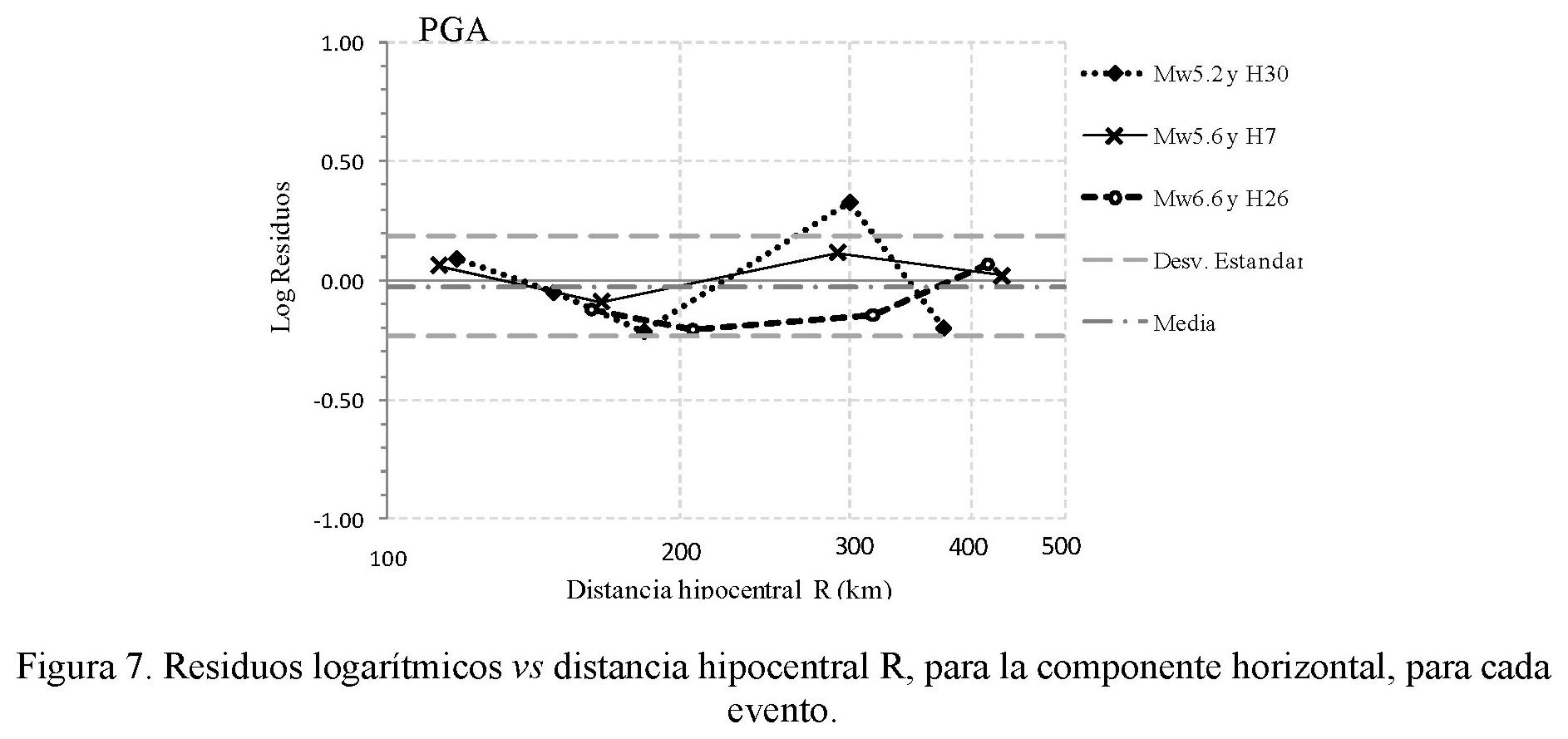 Por otro lado, los coeficientes de la relación de atenuación propuesta en este trabajo (ecuación 14) no resultan de fácil comparación con otras relaciones de atenuación, puesto que se encuentran en función de la magnitud Mw y profundidad H. Por lo anterior, se presenta una relación promedio que facilita el análisis de la similitud de sus coeficientes con otras relaciones de atenuación (e.g., Ordaz et al., 1989; García, 2006) con lo cual es posible valorar la congruencia y sentido físico del fenómeno de atenuación sísmica regional.