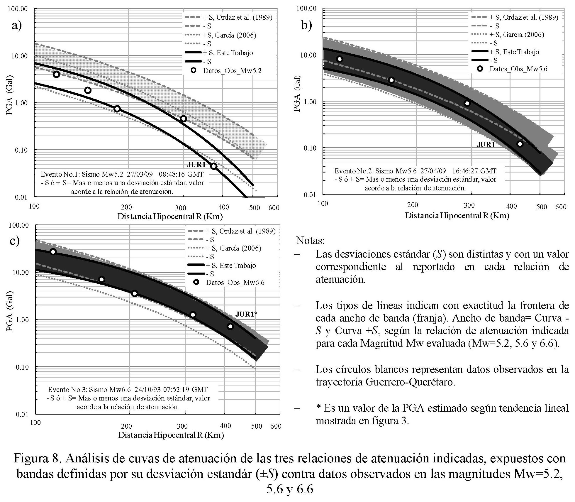 1. Que el ancho de banda de la relación de atenuación de Ordaz et al. (1989) en la figura 8a, correspondiente al evento de magnitud Mw=5.2 sobrestima más allá del rango de su desviación estándar puesto que ningún punto observado cae dentro de tal franja. Por otro lado, en el ancho de banda de la relación de atenuación de García (2006) se incluye la mayoría de los puntos observados, excepto el registrado a mayor distancia con ubicación en la estación JUR1.