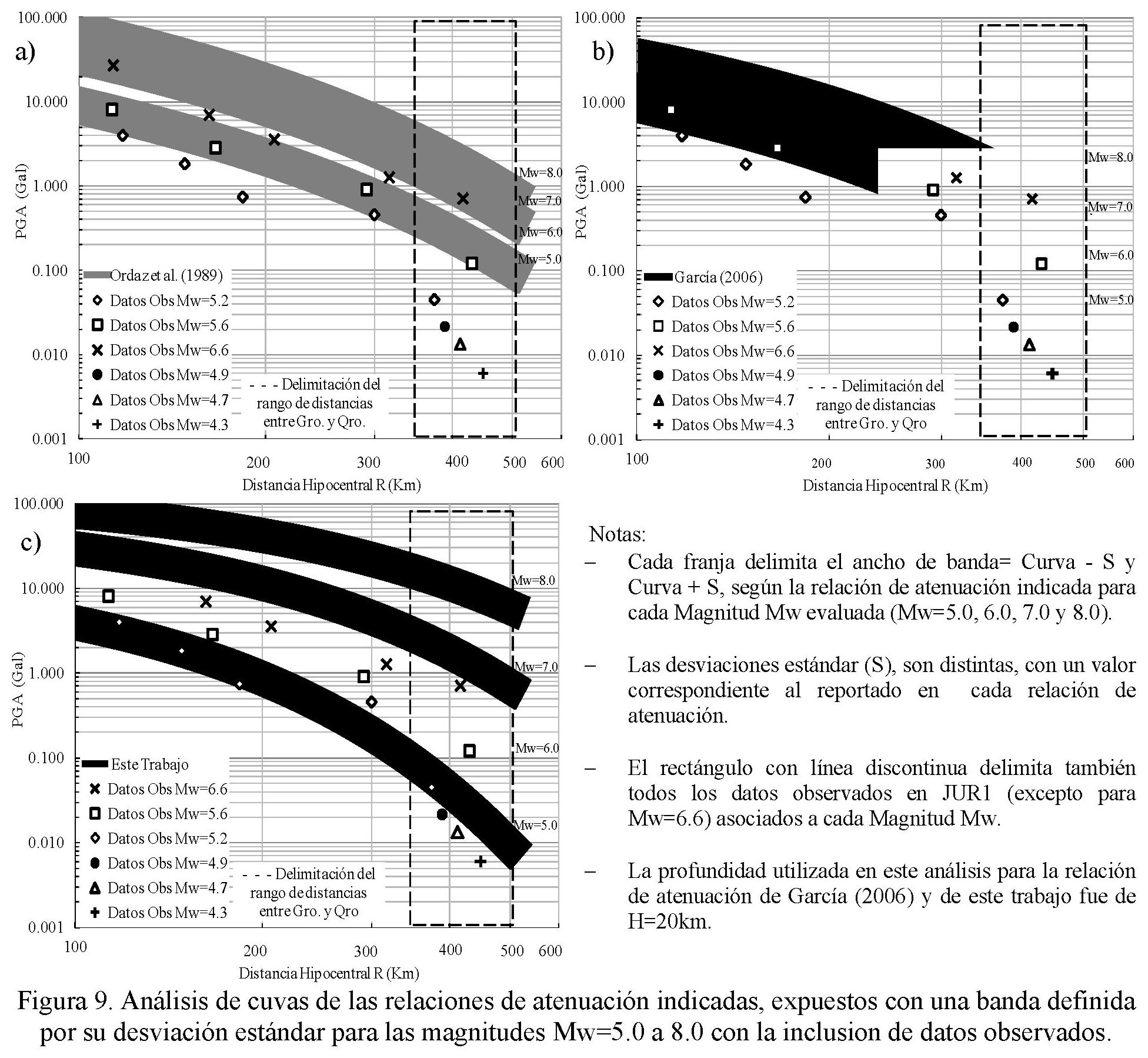 Dado el ejercicio anterior, en la figura 9 se propuso anteponer gráficamente el ancho implícito para cada una de las relaciones de atenuación en comparación con la presentada en este trabajo, considerando las magnitudes más representativas ante el peligro sísmico así como la inclusión de todos los datos observados y empleados en este estudio. Así mismo se enfatizó en los valores de la PGA a distancias cercanas a la estación JUR1, (rectángulo de línea discontinua, figura 9) debido a que las relaciones de atenuación en comparación no son respaldadas con datos observados a éstas distancias y que muy probablemente sean en gran parte los responsables de las diferencias de las curvas de atenuación además del análisis por trayectoria y del tipo de metodología propuesta. A partir de este análisis es posible reconocer lo siguiente:
