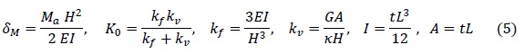 En las expresiones anteriores E es el módulo de elasticidad, G el módulo de cortante, I el momento de inercia, A el área de la sección transversal del muro, k el factor de forma para obtener el área de cortante, t el espesor del muro y H la altura del muro referida al centro de la losa.
