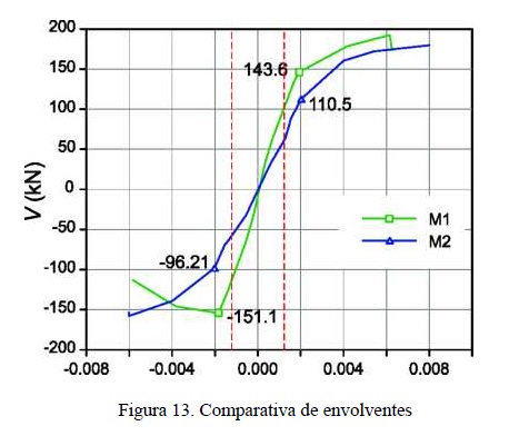 Las curvas carga contra distorsión de los muros M1 y M2 se muestran en la fig. 12. Pese a que el comportamiento de los muros exhibe cierto nivel de simetría, es notorio el hecho de que la resistencia máxima es asimétrica y mayor en la rama positiva. Esta diferencia es mayor en el muro M1 y menos marcada en el muro M2.