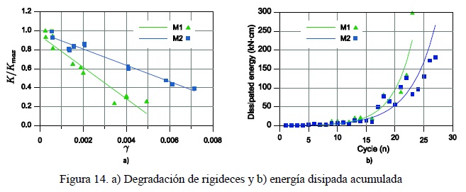 donde (di , fi) es el iesimo punto de la curva de histéresis. La disipación de energía acumulada de los muros M1 y M2 se muestra en la fig 14.b. Como en el caso de la degradación de rigidez, estas curvas están correlacionadas con el nivel de daño en el muro. Se puede interpretar que el daño de los muros sin momento flexionante en su extremo superior en el que la distorsión es debida en mayor medida a corte, el daño es mayor para el mismo número de ciclos.